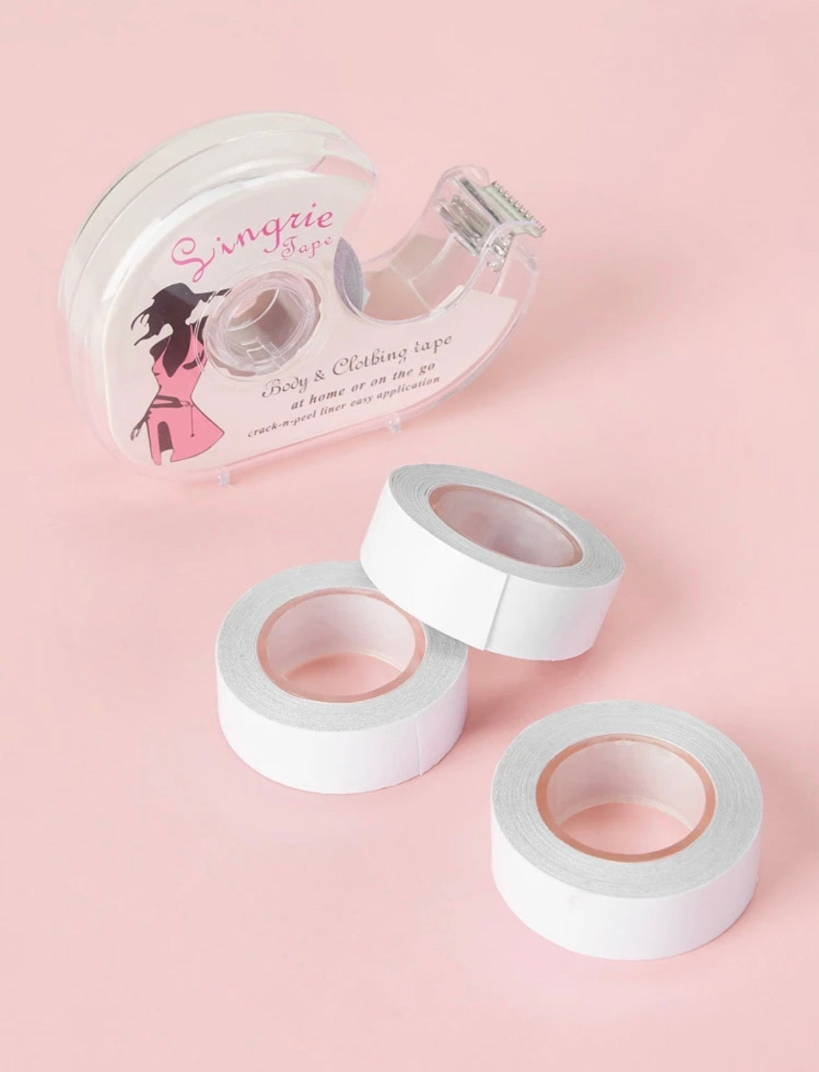 - Este adhesivo ayuda a fijar la ropa al cuerpo. Trae 3 rollos más el cortador.